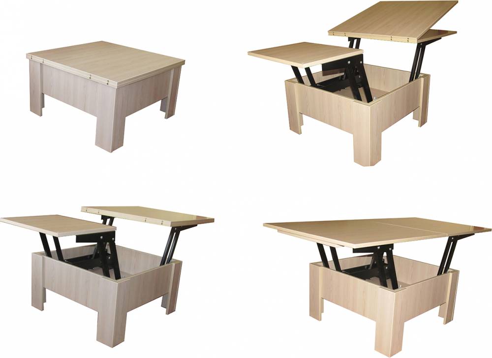 Якісний, надійний механізм, найкращий по конструкції зі всіх існуючих механізмів для столів-трансформерів. Складається з двох незалежних частин, що дозволяє виготовляти різноманітні розміри столів, при цьому. механізм завжди розміщений при зовнішньому краю кришки, що забезпечує стійкість конструкції. Для полегшення підняття кришки, та безшумного й легкого ходу застосовуються потужні пружини, з трьома ступенями регуляції, в залежності від ваги кришки. Чим масивніша кришка - тим більший повинен бути натяг пружини .Ця конструкторська розробка дозволяє без зусиль складати та розкладати стіл однією рукою навіть жінці чи підлітку В розкладеному вигляді конструкція міцна, без люфтів та зазорів. В розкладеному вигляді місце з`єднання кришок не просідає.